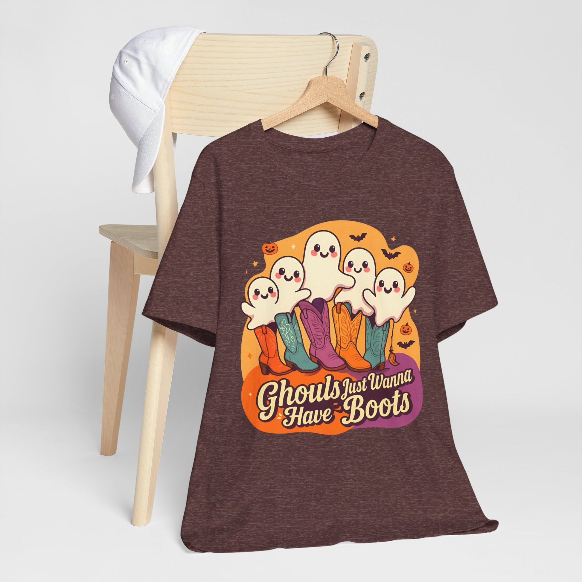 Add some sass to spooky season with our Ghouls Just Wanna Have Boots Shirt. Featuring a playful cowgirl ghost design, this Western Halloween tee is the perfect mix of cute and spooky for fall-loving women.