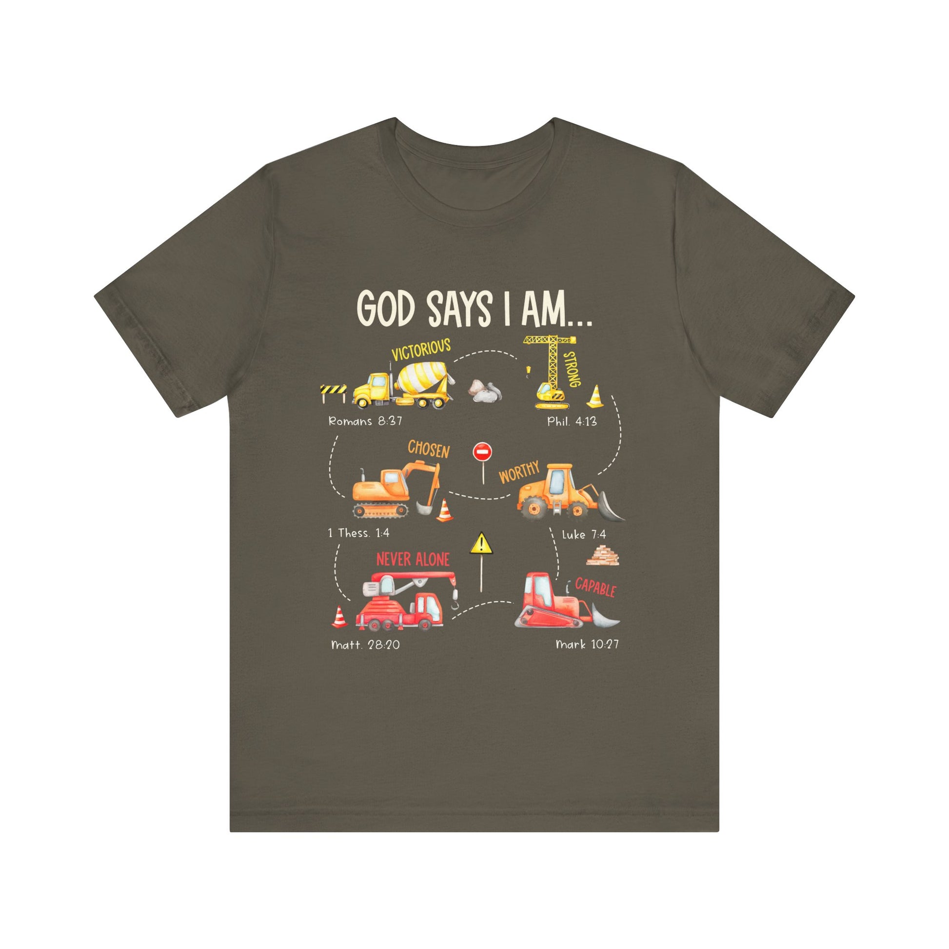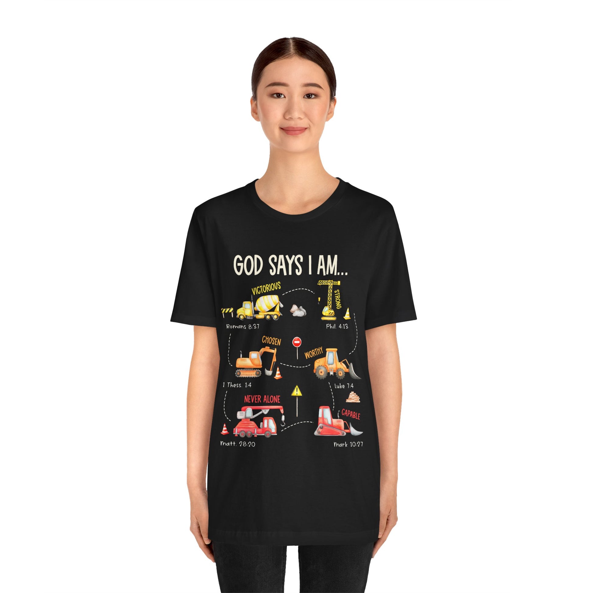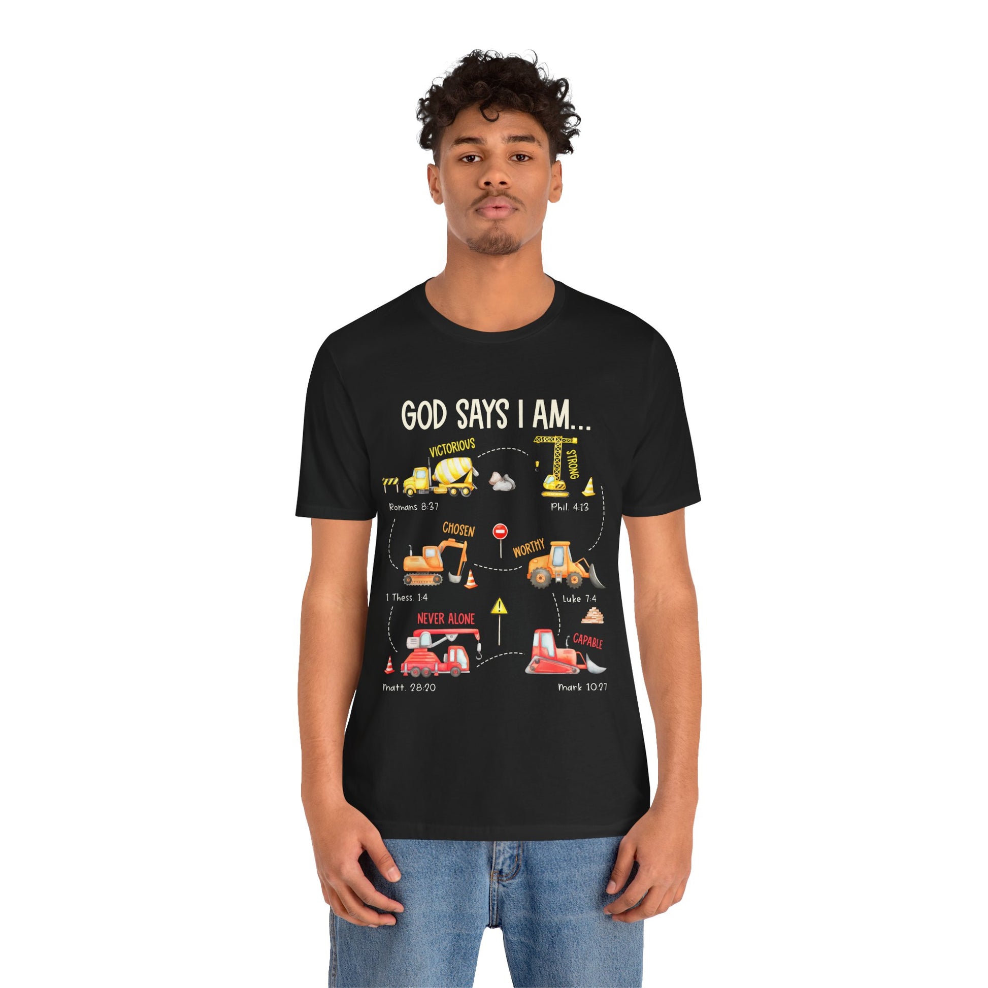 God Says I Am Construction Bible Verse Machines Vehicles T-Shirt, Christian Tee with Trucks