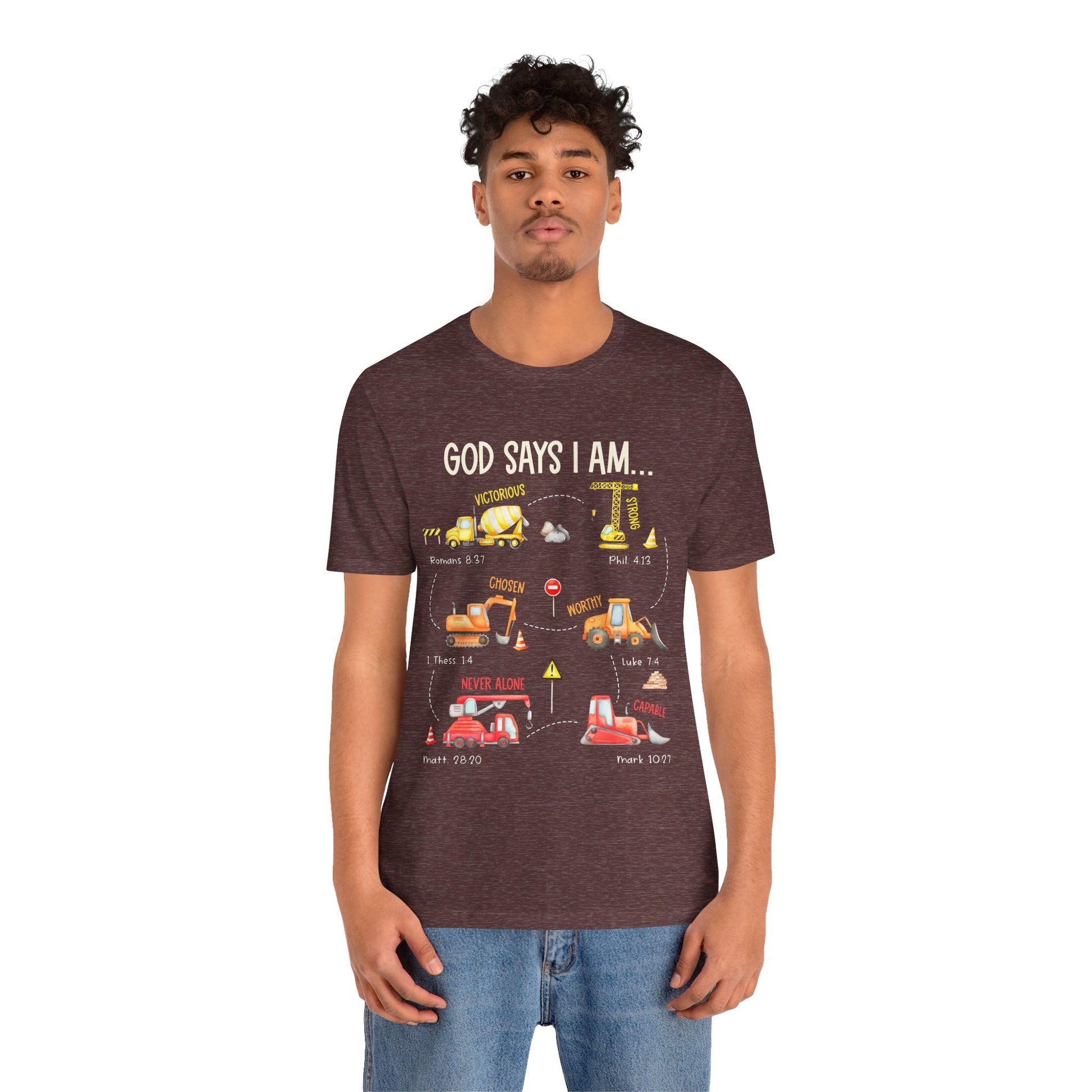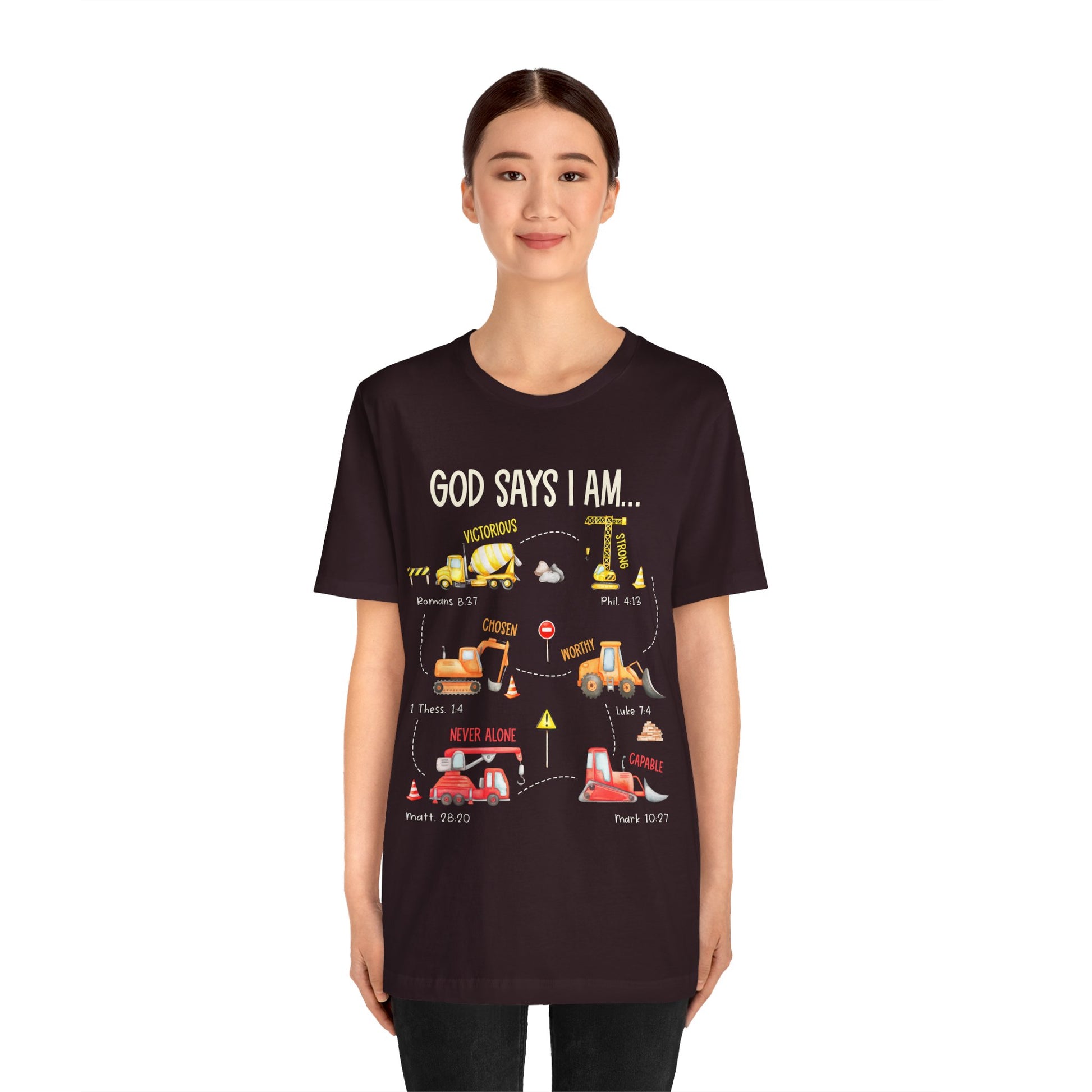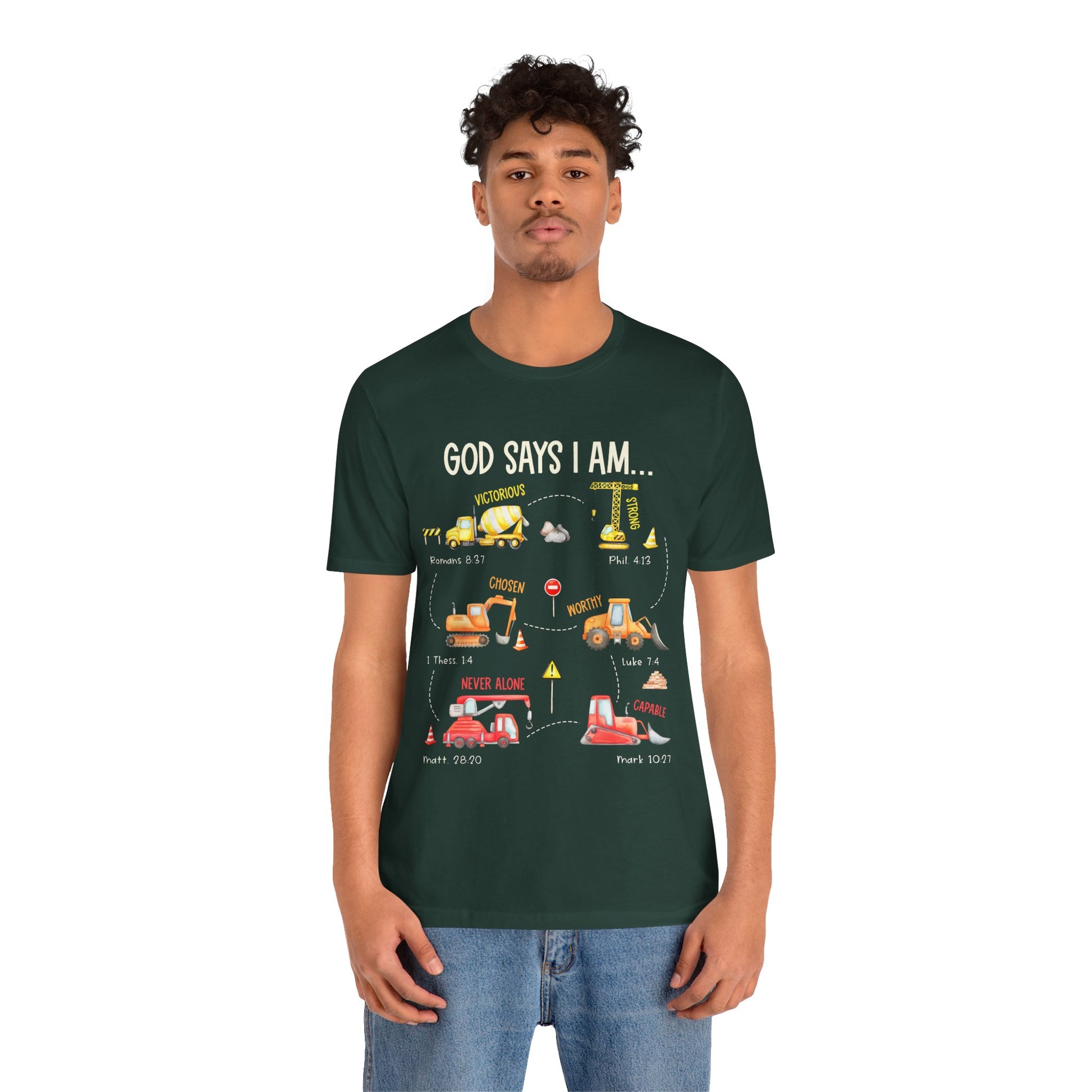 God Says I Am Construction Bible Verse Machines Vehicles T-Shirt, Christian Tee with Trucks