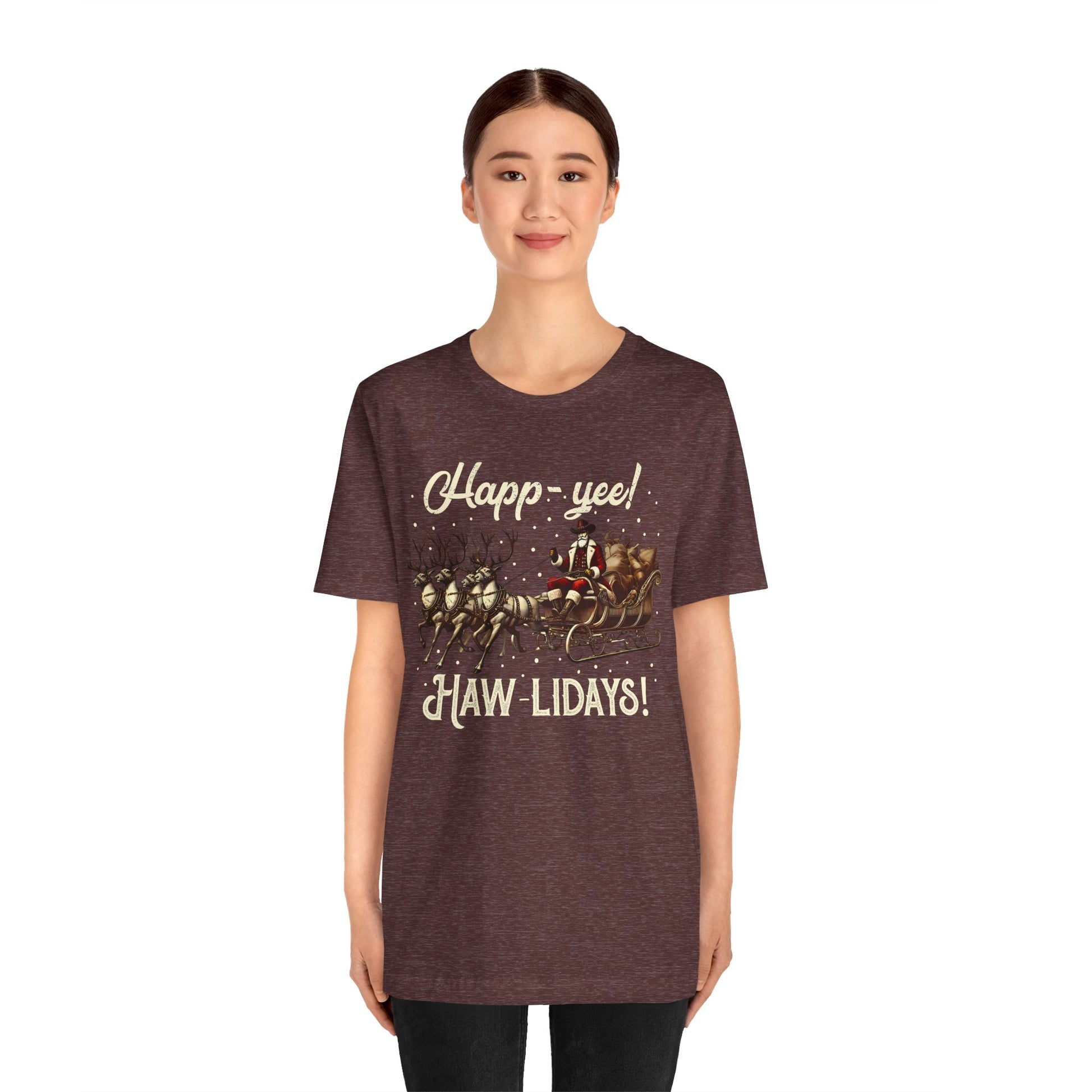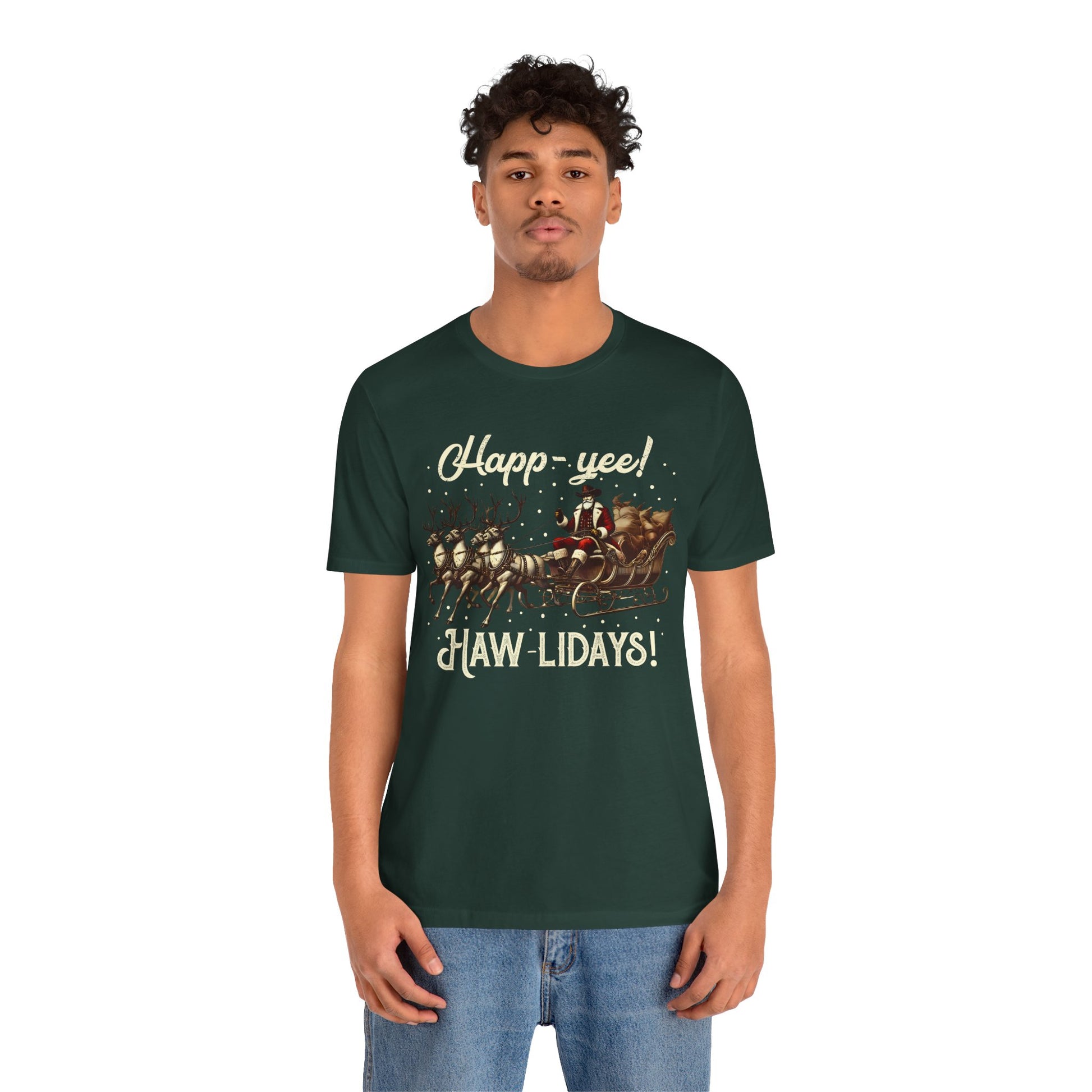 Bring rodeo spirit to the season with our Happy Yeehaw Holidays Shirt. Featuring a festive Western Santa and playful “Hawliday” howdy design, this Christmas tee is perfect for cowboys, cowgirls, and country fans who love holiday humor.