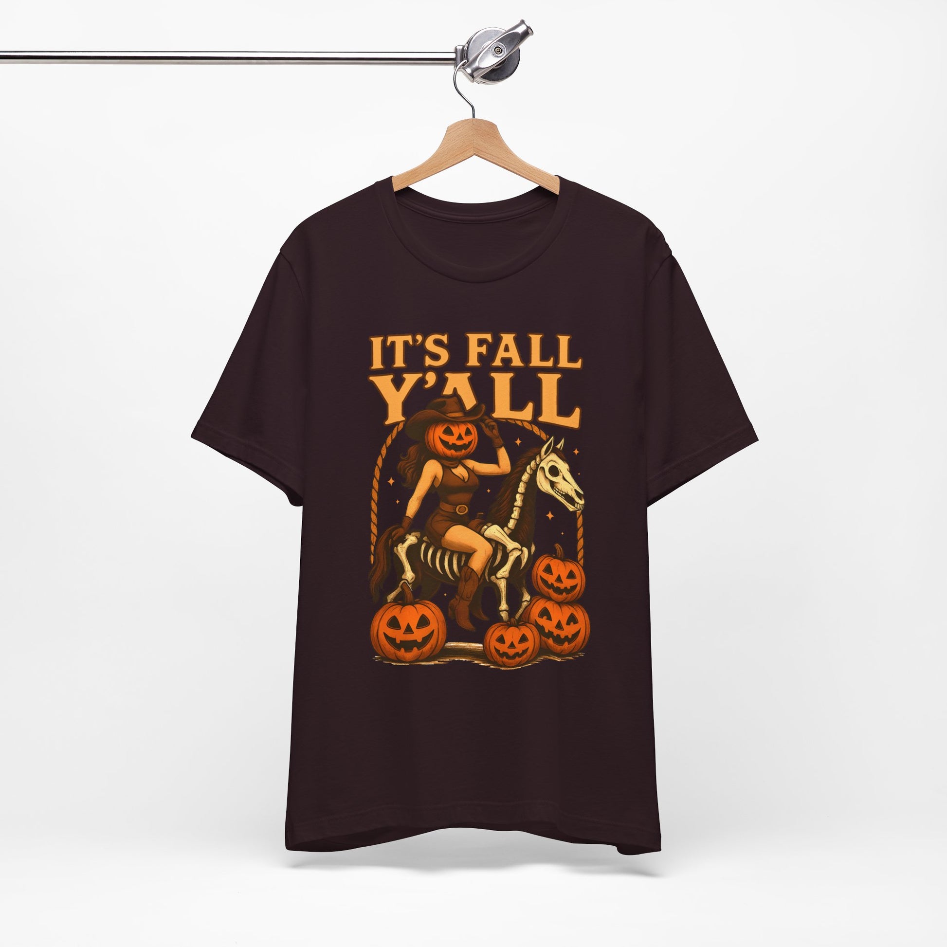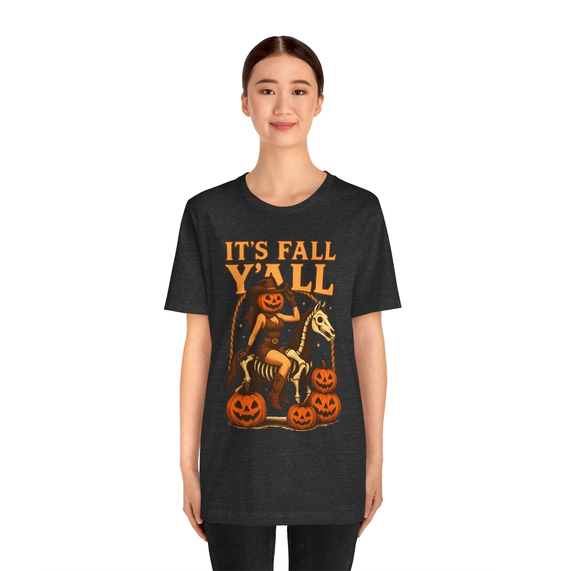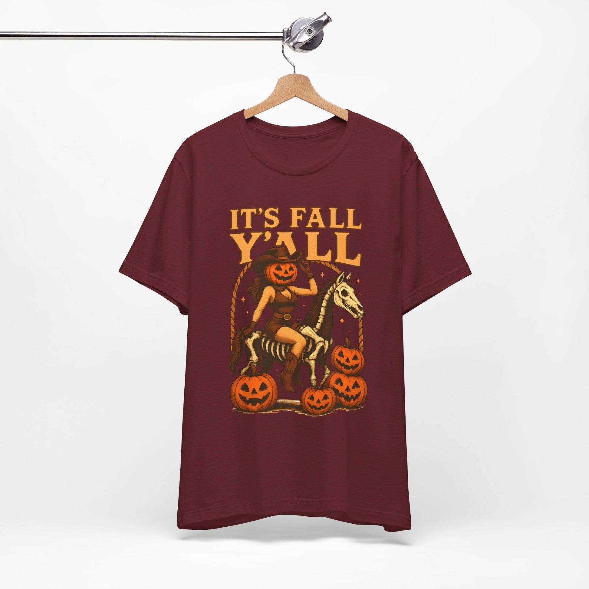 Kick off spooky season rodeo-style with our It’s Fall Y’all Shirt. Featuring a pumpkin head cowgirl riding a skeleton horse, this Western Halloween tee is the perfect mix of creepy fun and country charm.