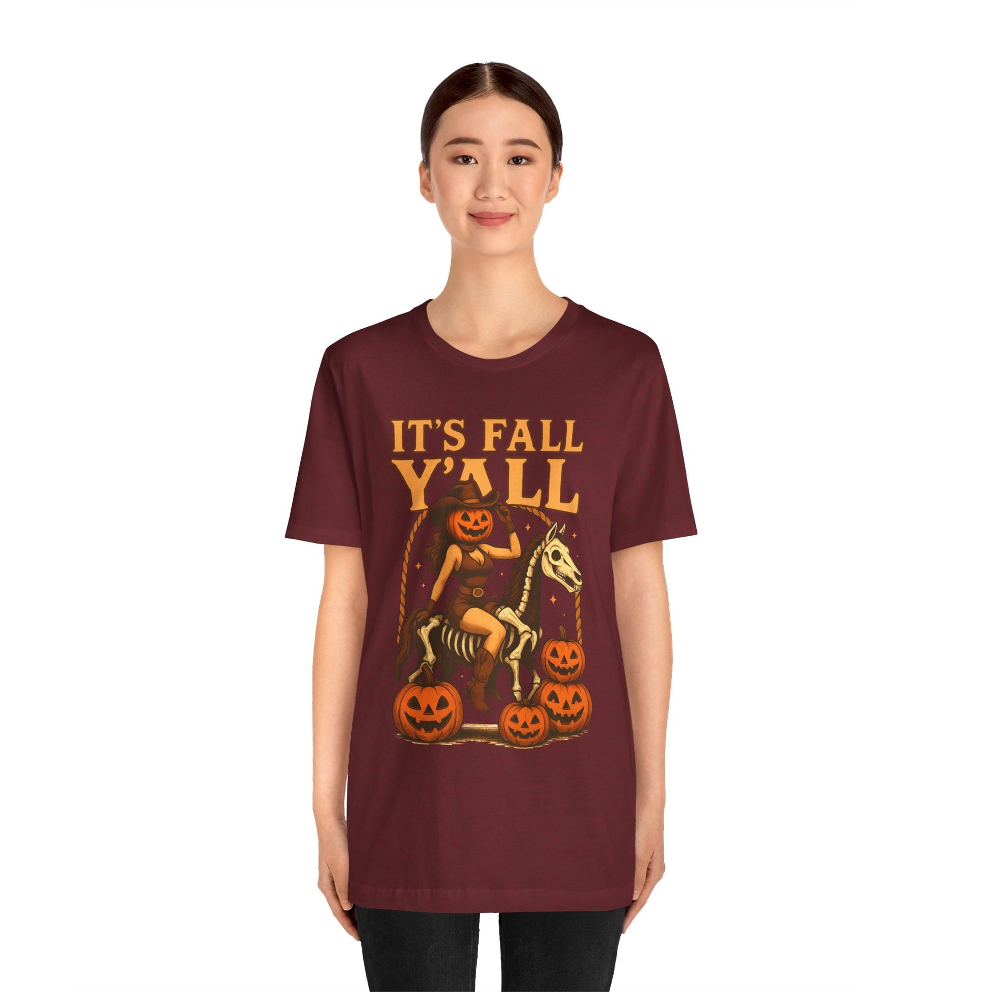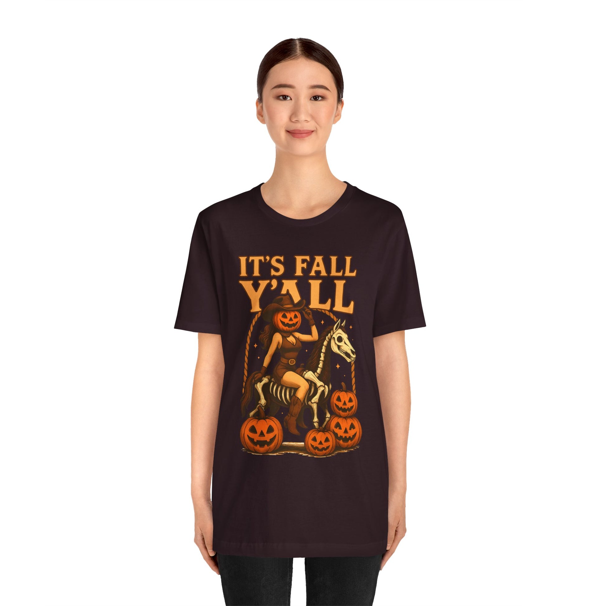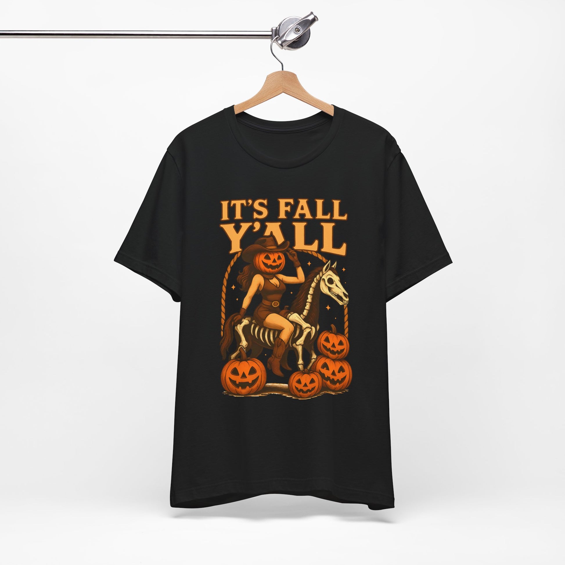 It’s Fall Y’all Shirt – Pumpkin Head Cowgirl Skeleton Horse Western Tee