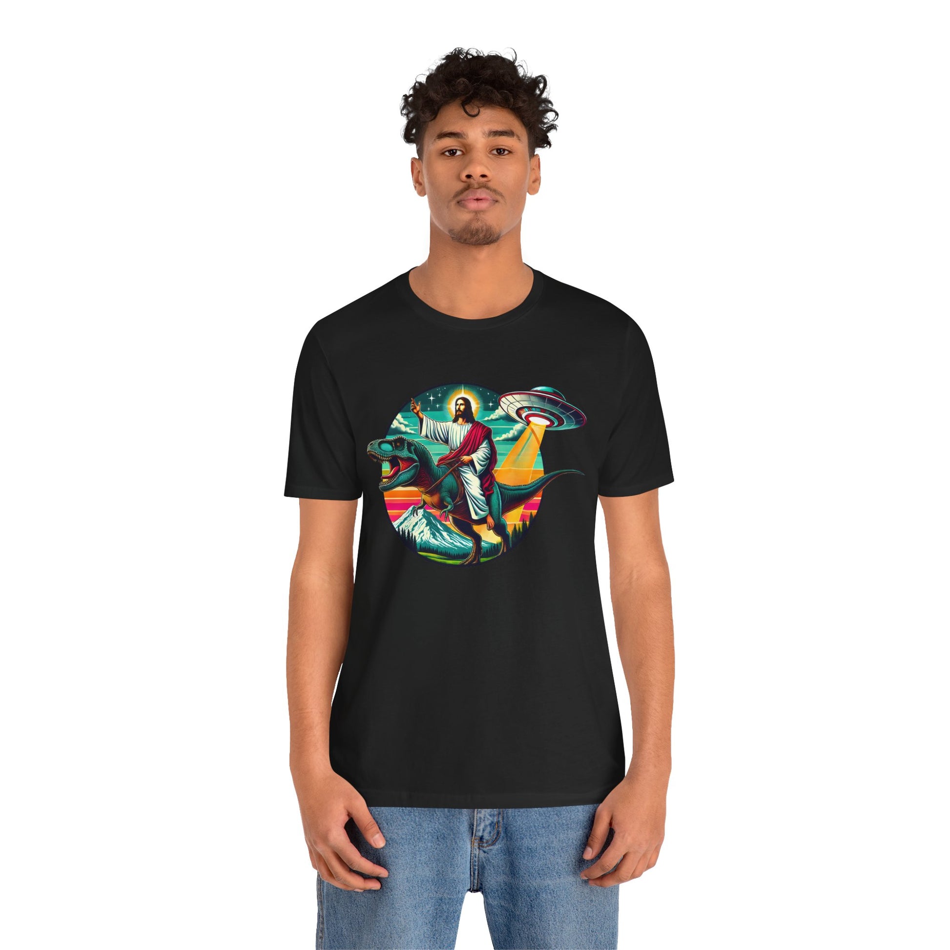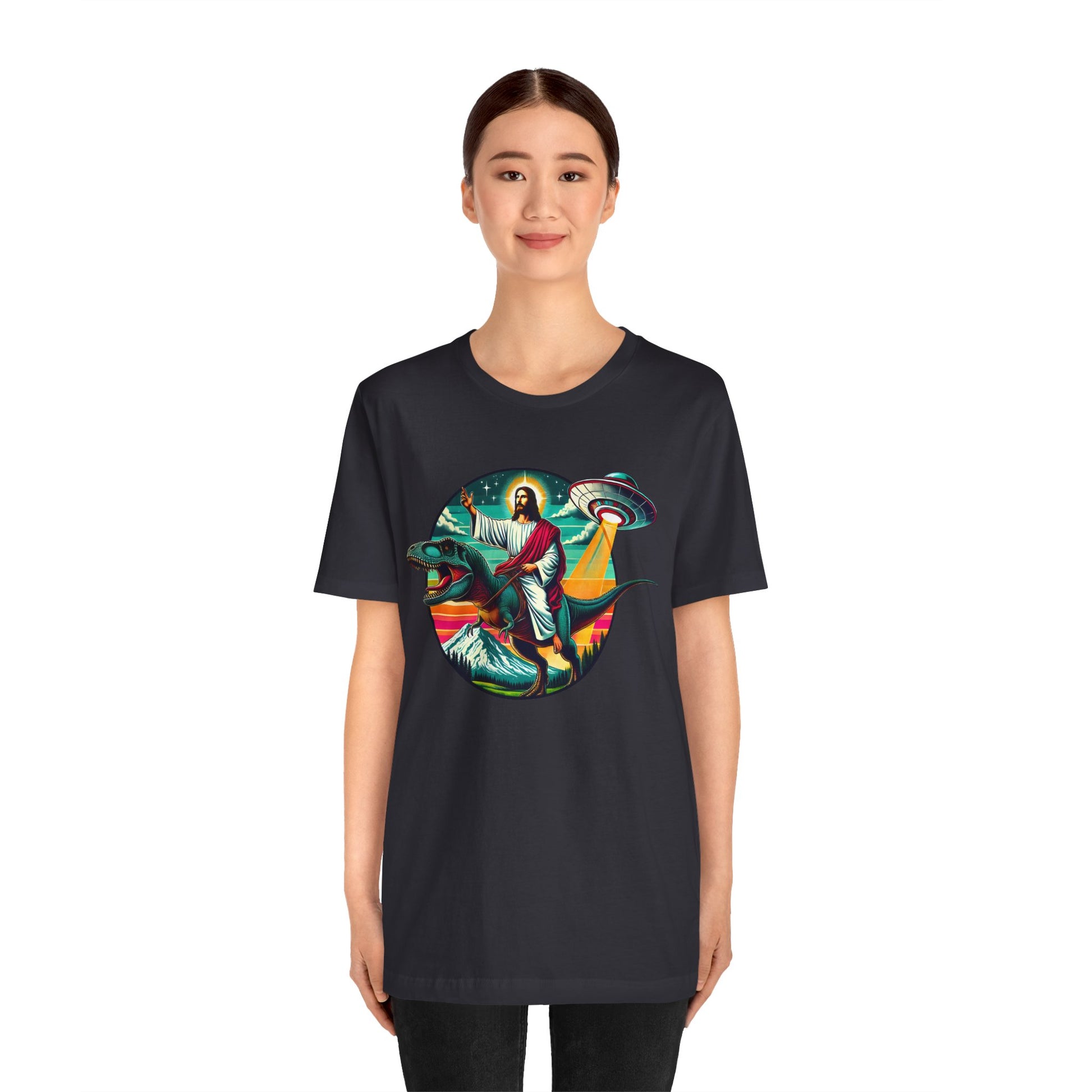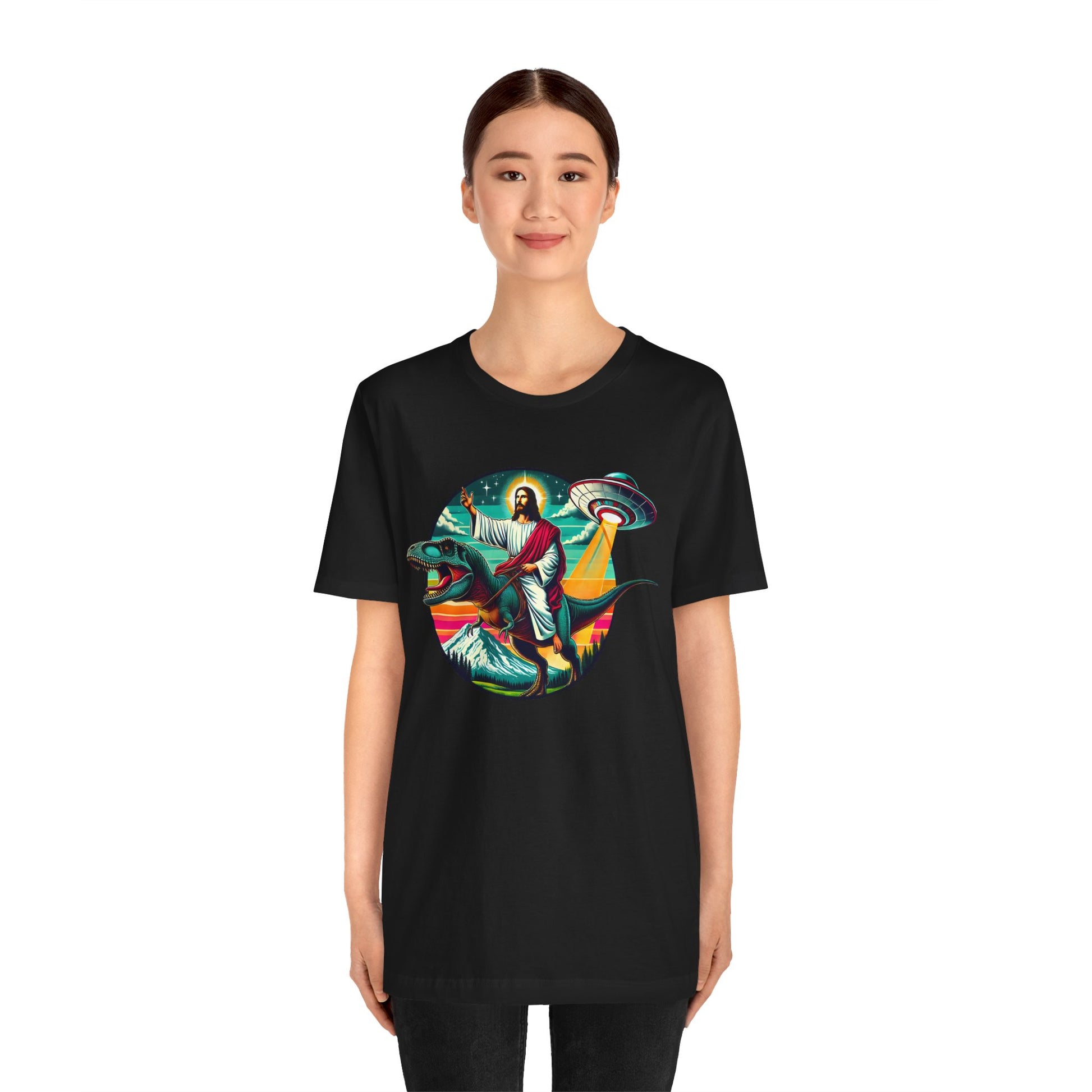 Jesus Riding Dinosaur Shirt – UFO Alien Cross Retro Christian God Tee