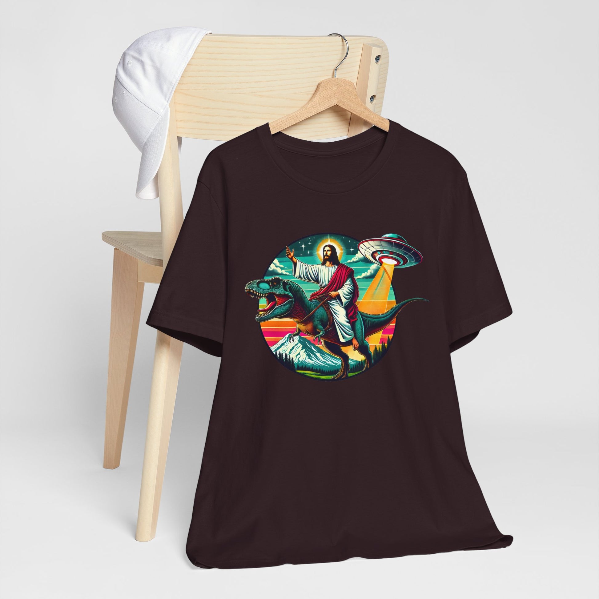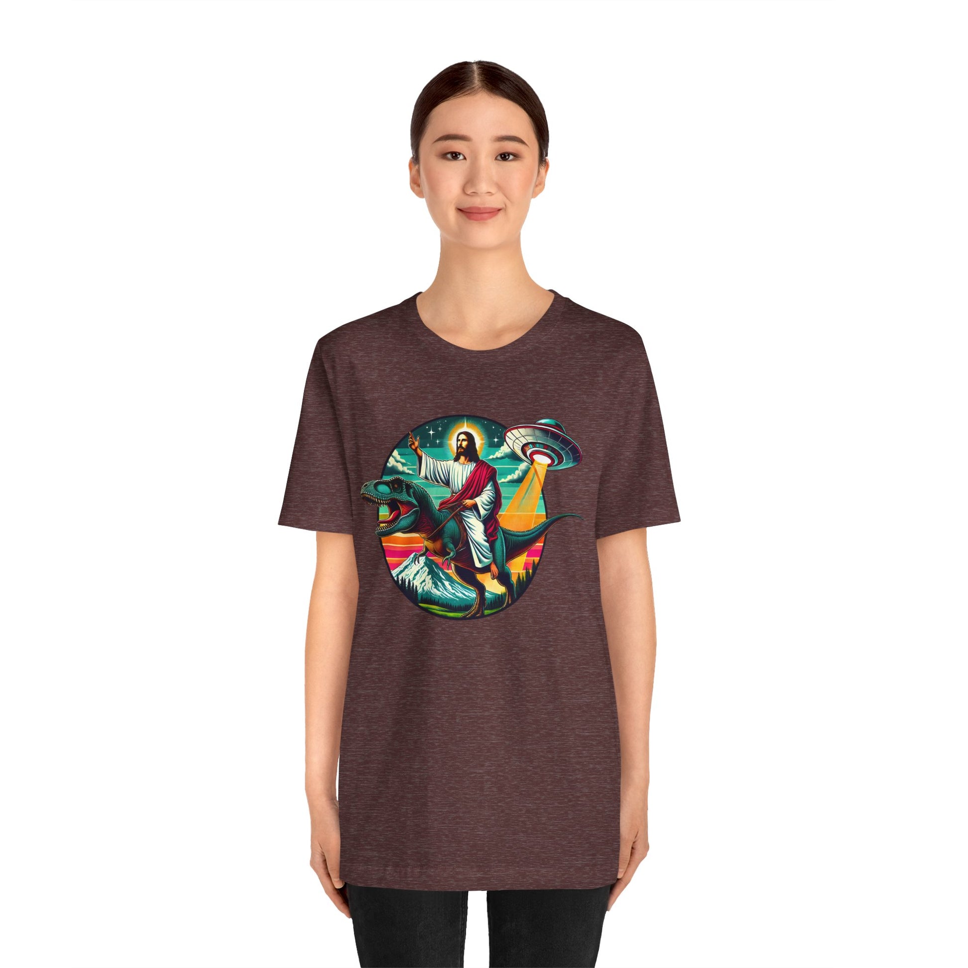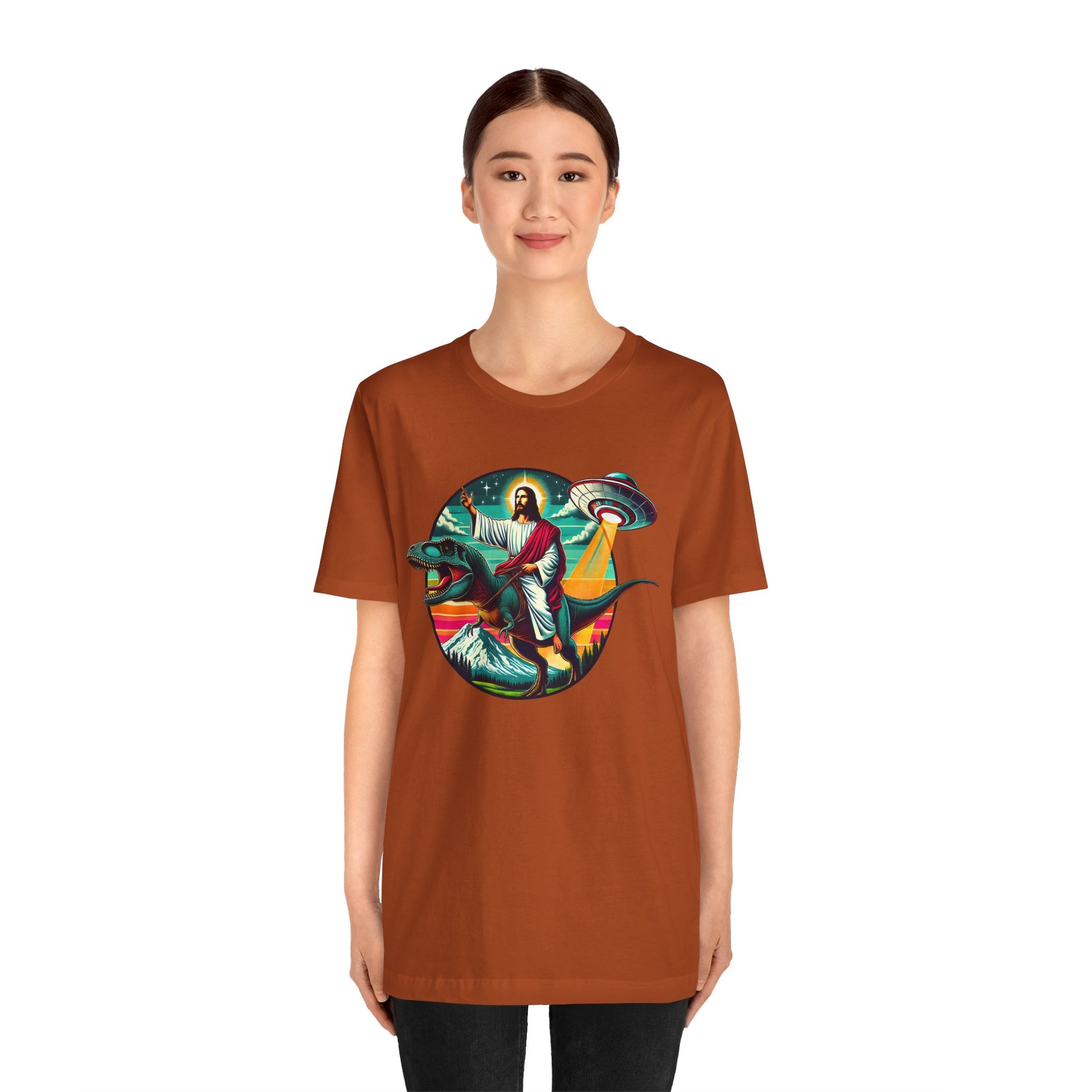 Jesus Riding Dinosaur Shirt – UFO Alien Cross Retro Christian God Tee