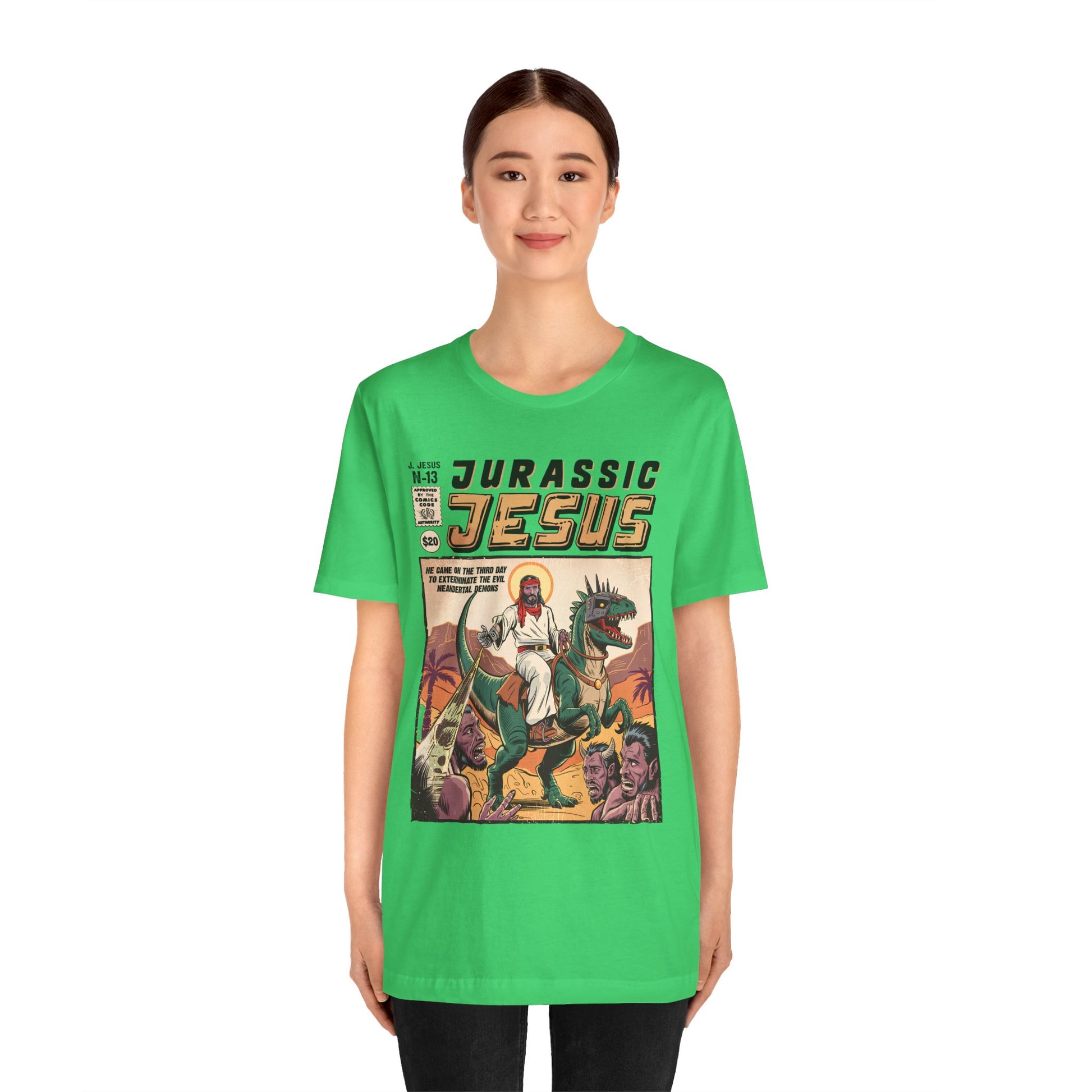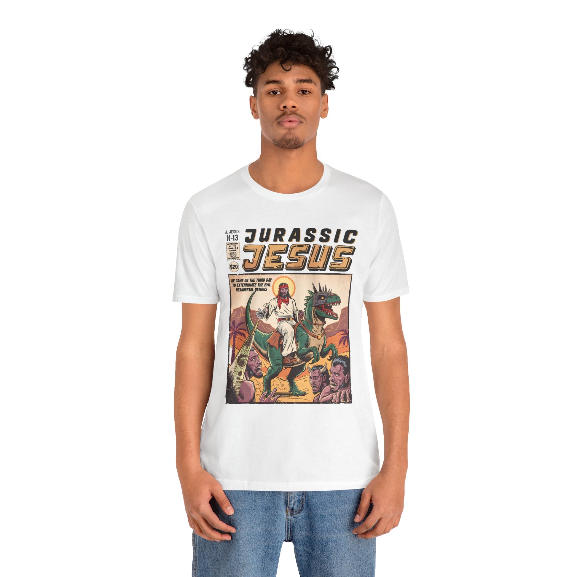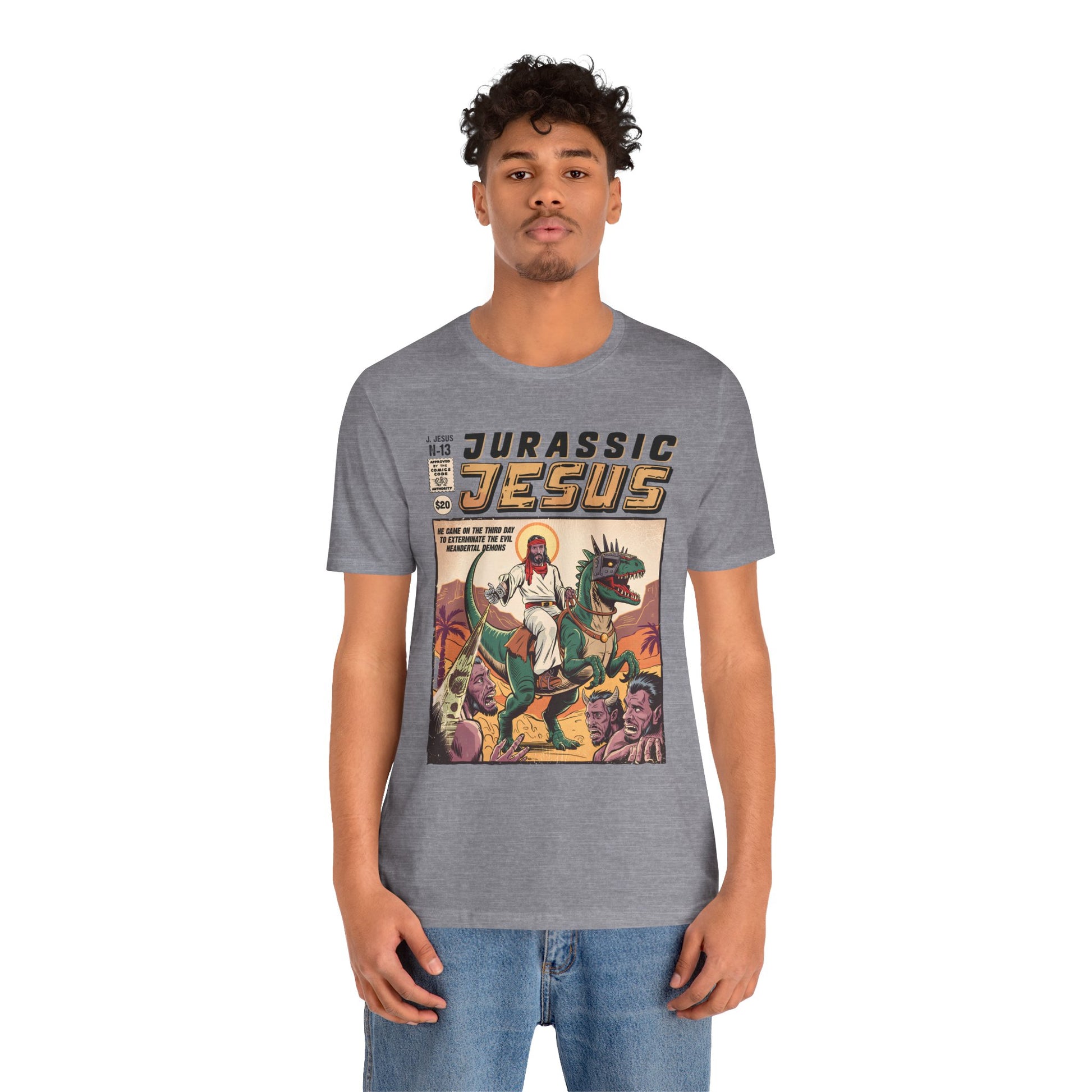 Bring faith and fun together with the Jurassic Jesus Dino-Riding Christian T-Shirt. Featuring a bold comic book–style design of Jesus riding a dinosaur, this tee is perfect for believers who enjoy quirky, creative, and conversation-starting faith fashion. Great for youth groups, comic fans, or casual everyday wear.