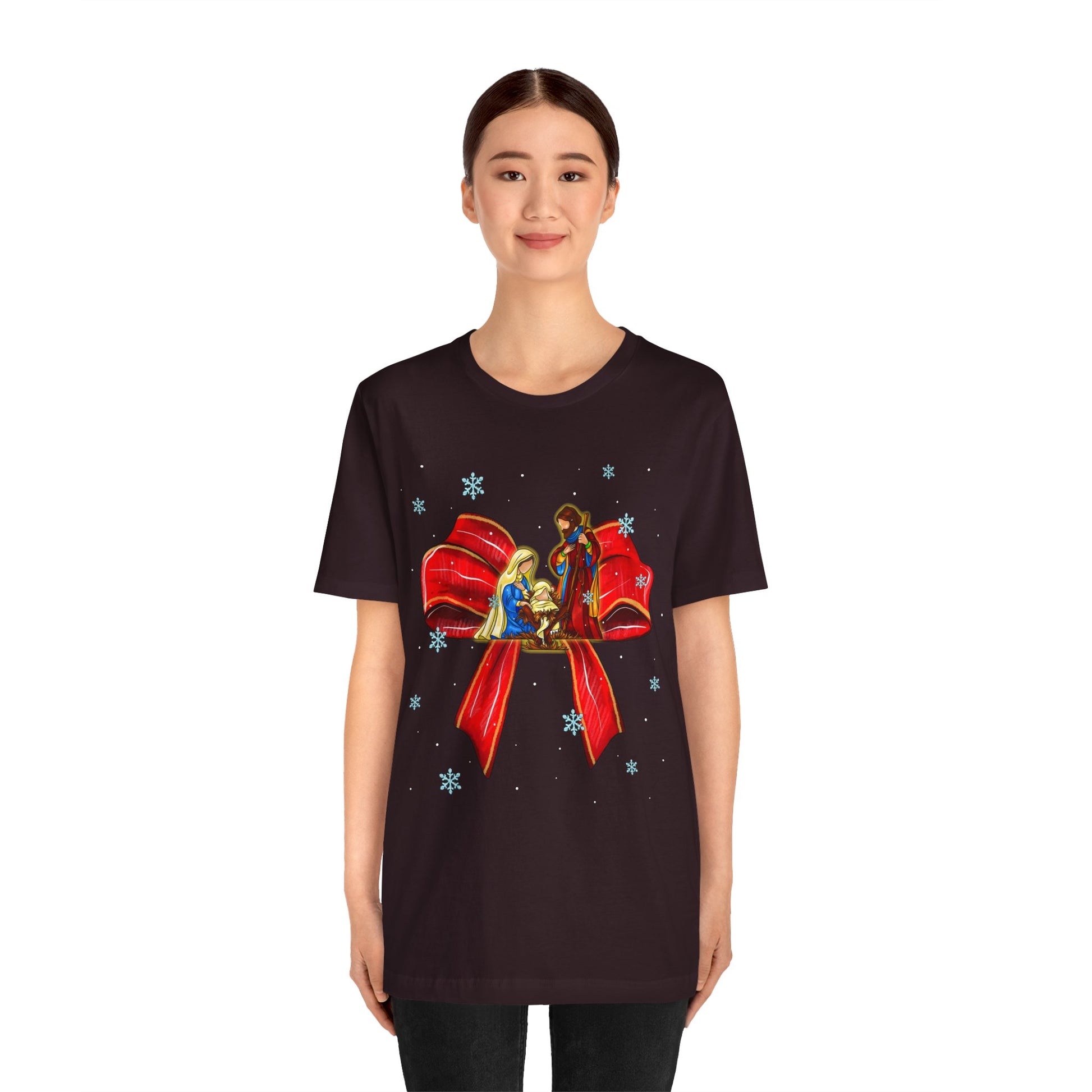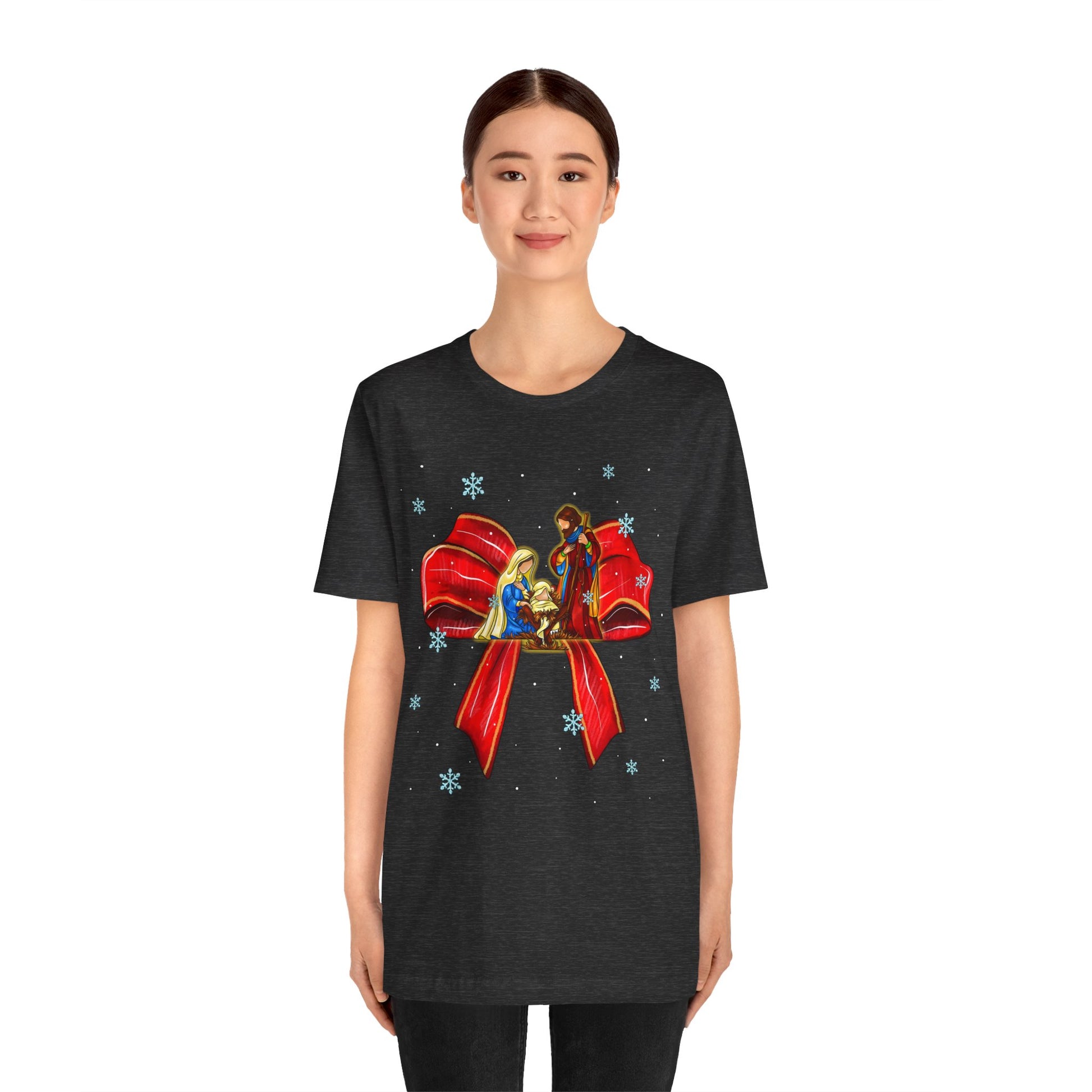 Keep Christ at the center of Christmas with our Nativity Scene Coquette Bow Shirt. Featuring a sweet bow accent and Nativity artwork, this faith-filled tee is perfect as holiday pajamas or a cozy reminder of the true meaning of Christmas.
