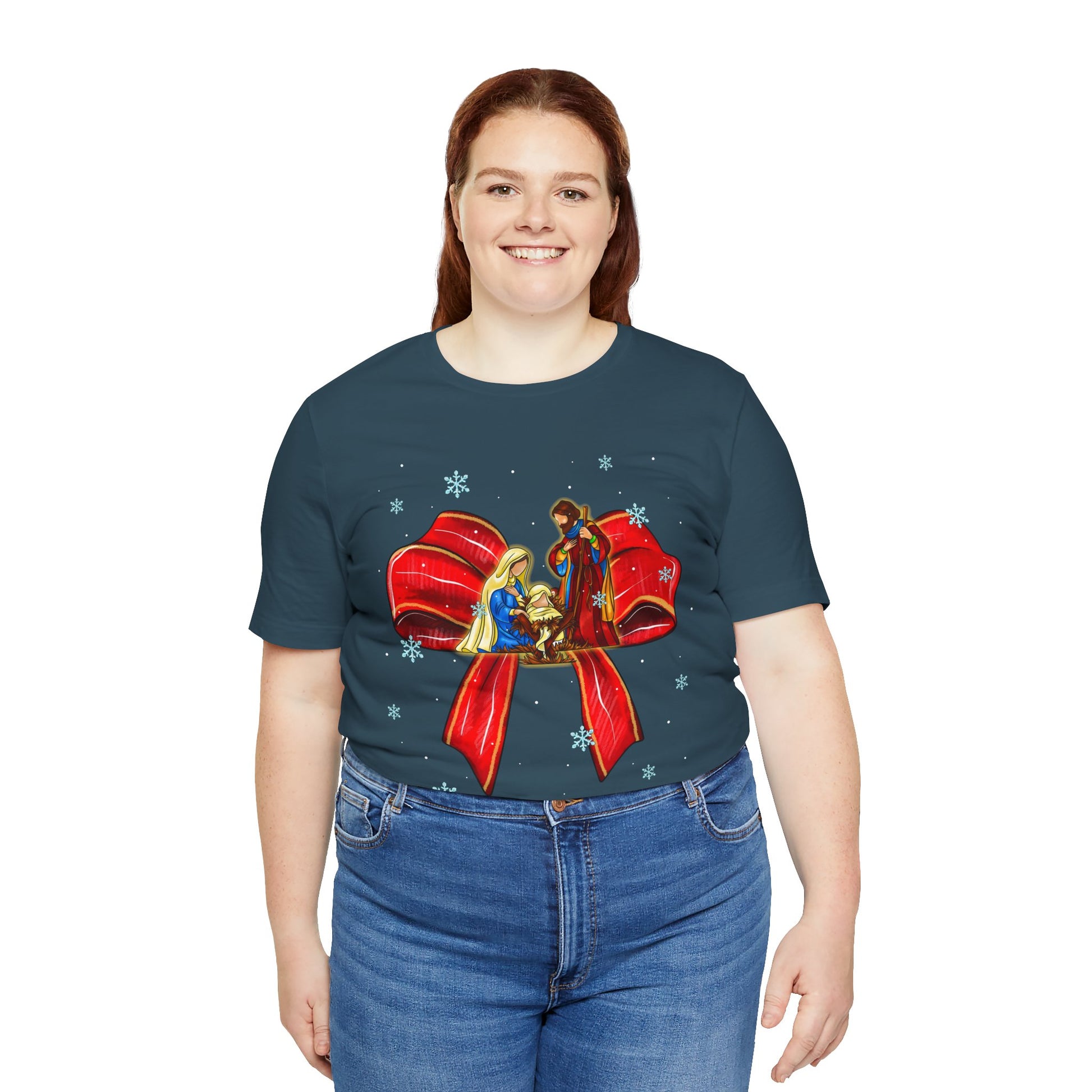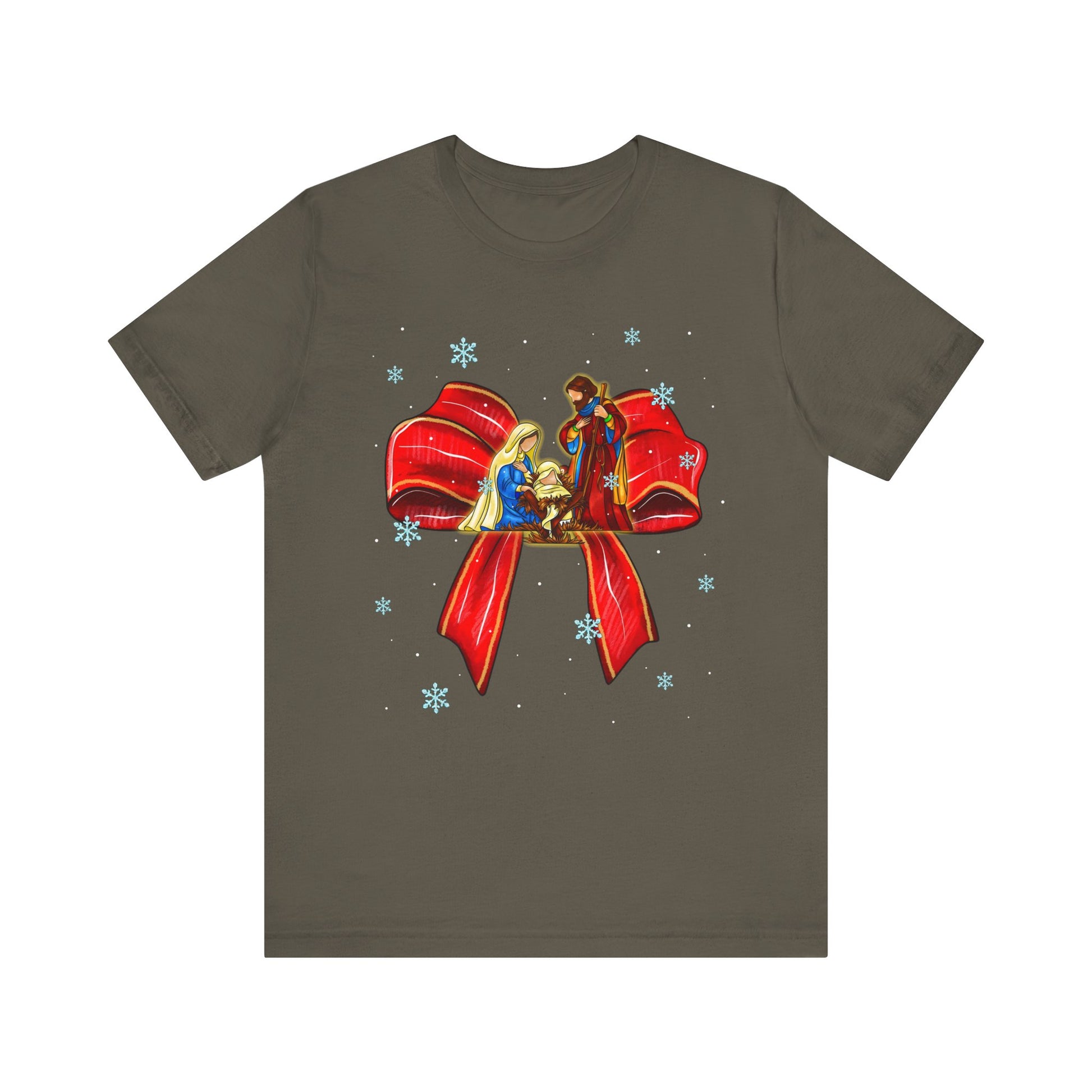 Nativity Scene Christmas Shirt – Coquette Bow Faith Tee, Jesus Holiday Pajama Top