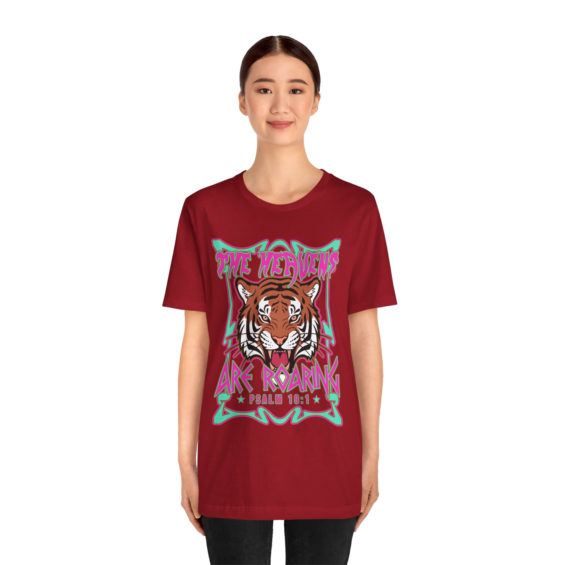 Declare God’s glory with the The Heavens Are Roaring Christian T-Shirt. Featuring a bold tiger design with the powerful Scripture from Psalm 19:1 — “The heavens declare the glory of God; the skies proclaim the work of his hands” — this tee is perfect for believers who love strong, faith-centered fashion. Great for church, Bible study, or casual everyday wear.