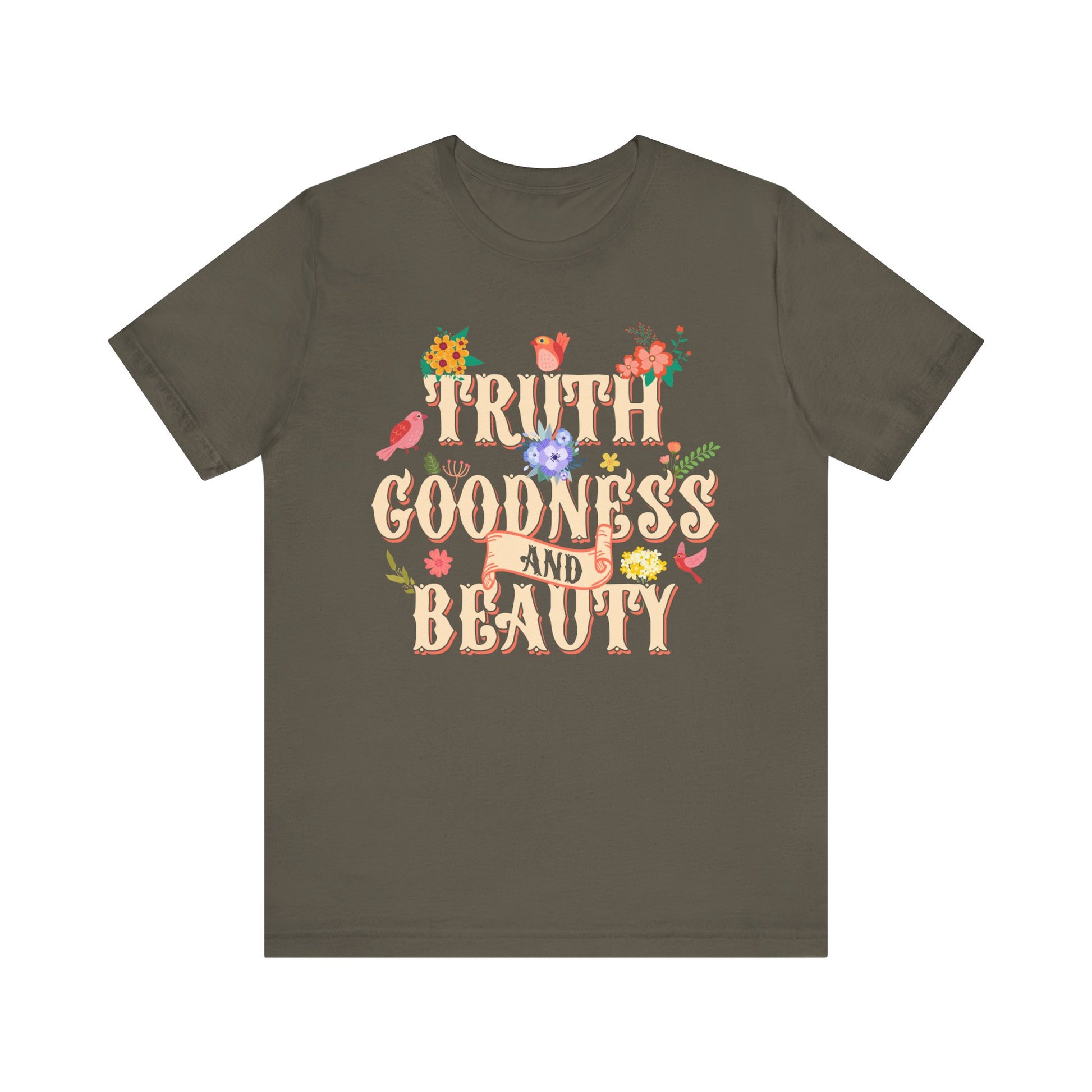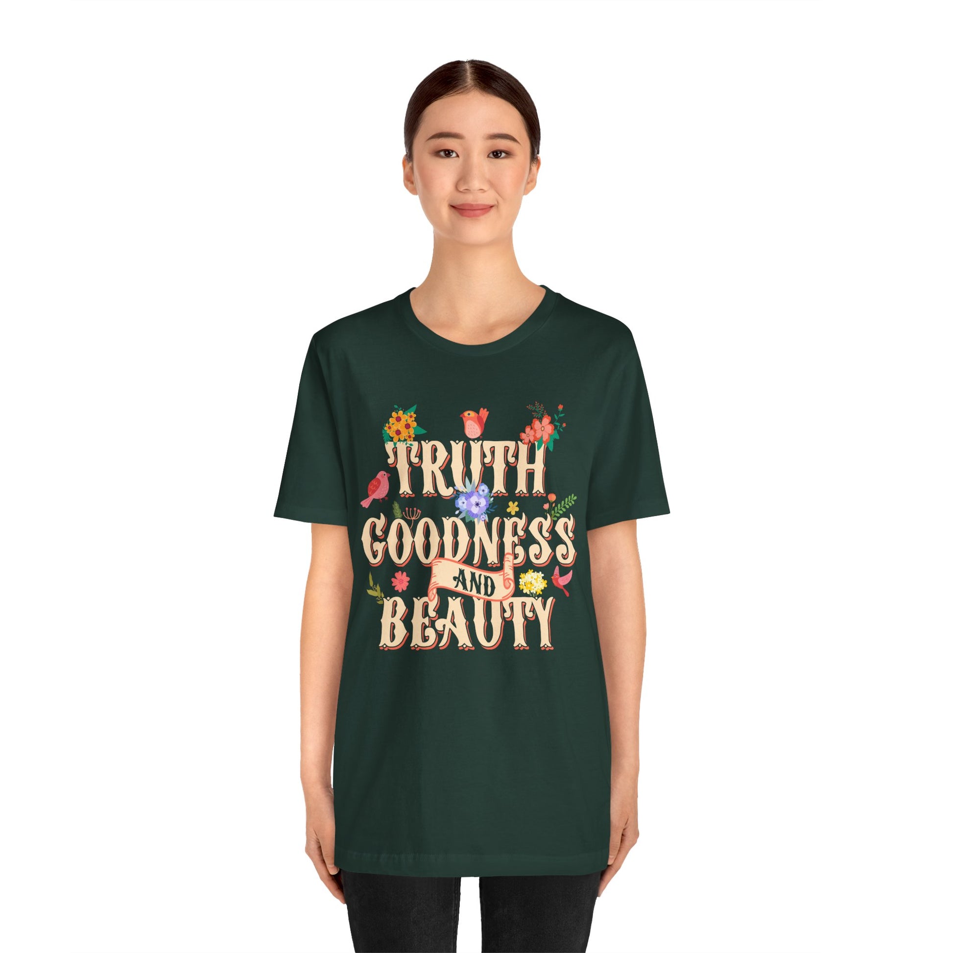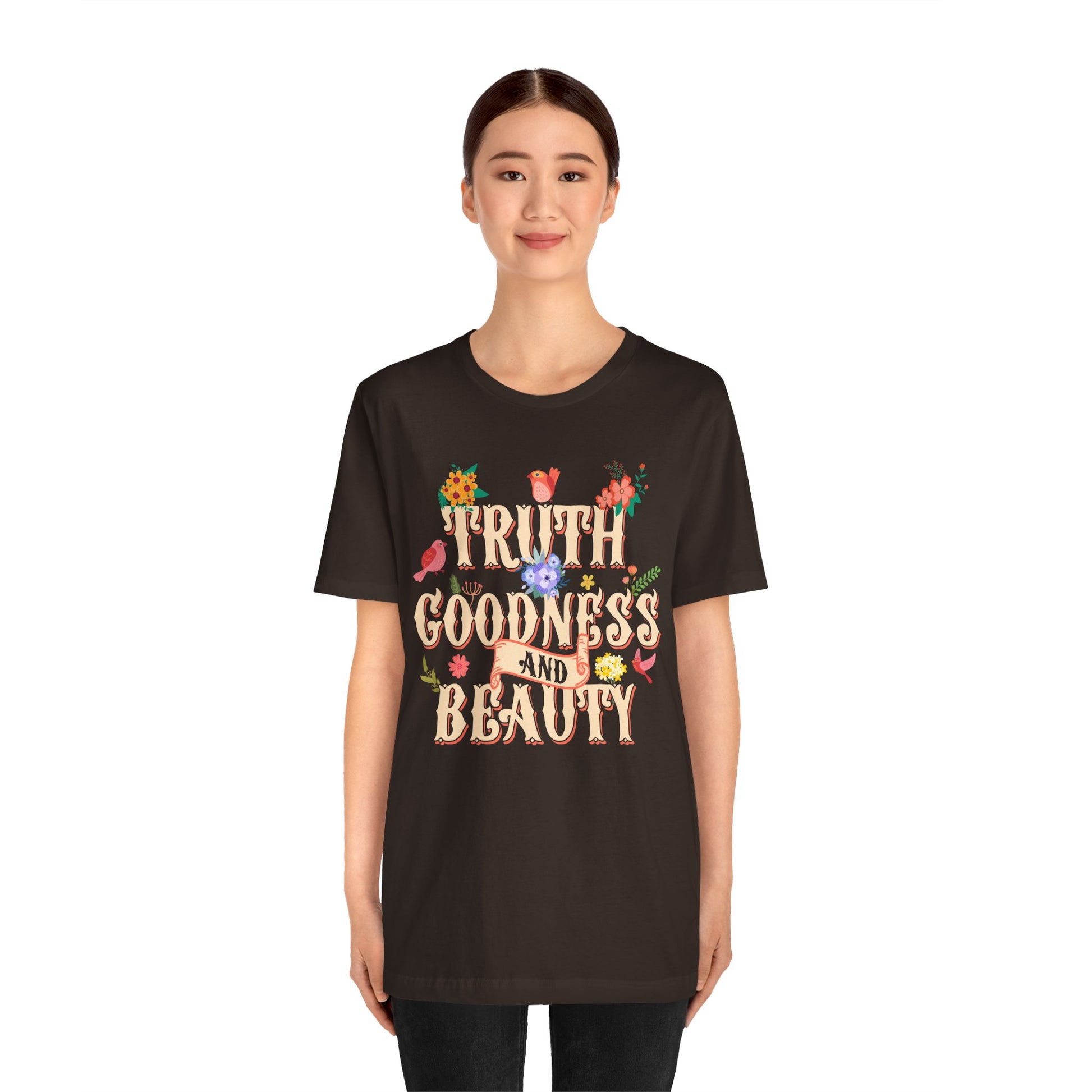 Celebrate timeless virtues with our Truth Goodness and Beauty Shirt. Featuring a retro floral Christian design inspired by scripture, this tee is a faith-filled reminder to live with grace and virtue. Perfect for women who love aesthetic Christian fashion with a meaningful message.