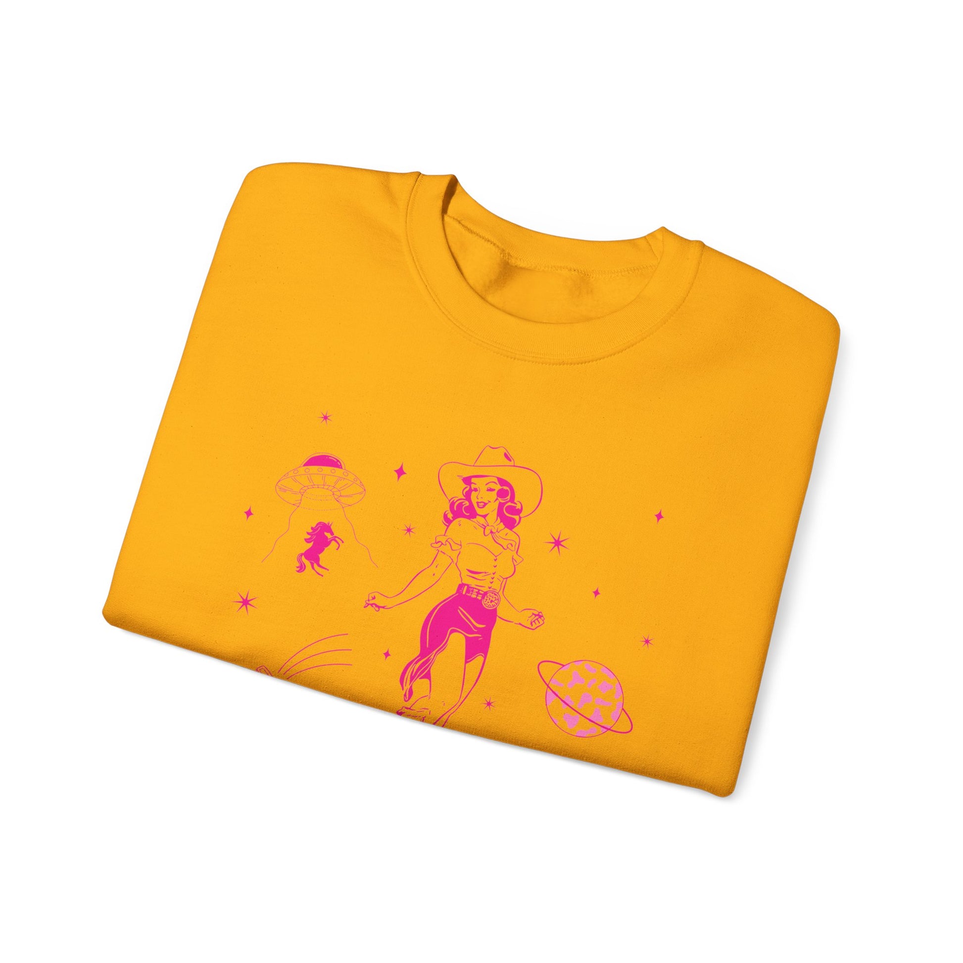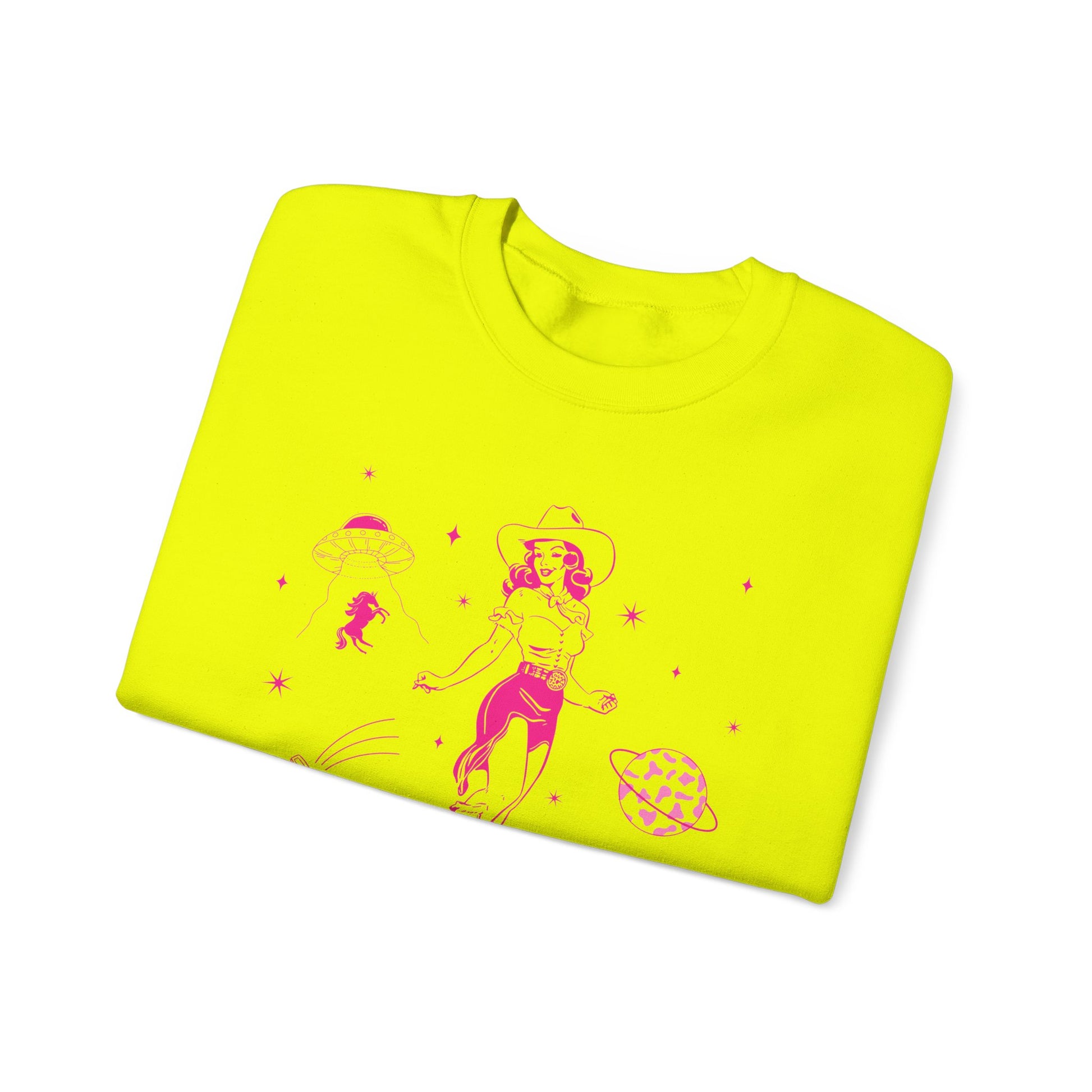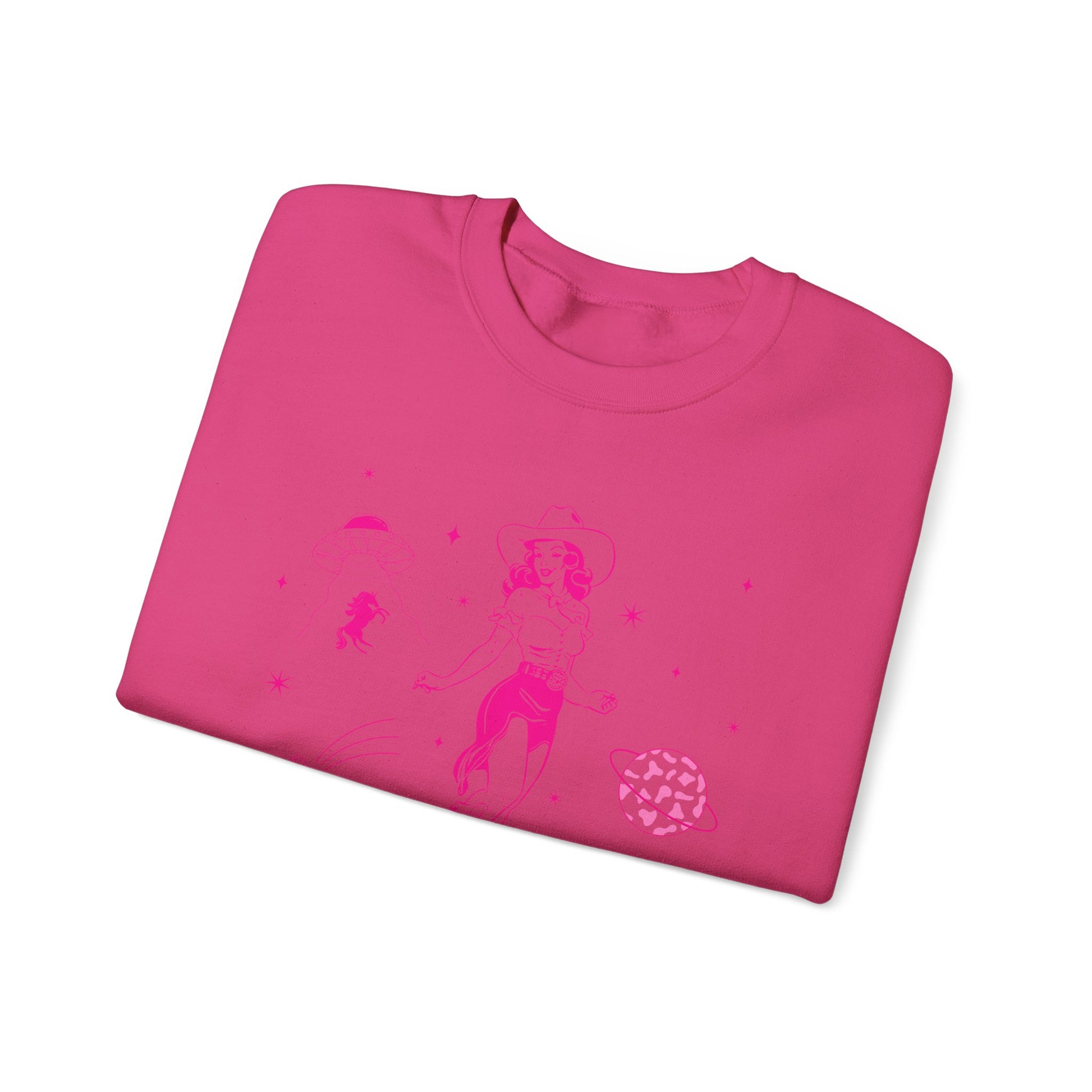 Shine with rodeo flair in the Western Cowgirl Howdy Disco Sweatshirt. Featuring a fun space-cowgirl inspired design with rodeo and bachelorette party vibes, this pullover is perfect for women who love Western fashion with a bold, playful twist. Great for nights out, rodeos, concerts, or casual everyday wear.